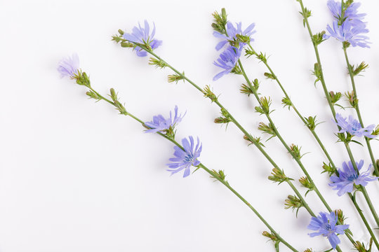 Die Blütenkörbchen bestehen nur aus Zungenblüten. Sie haben einen Durchmesser von 3 bis 5 cm, die seitlichen stehen meist zu zweit bis fünft. Sie sind kurz gestielt oder sitzend. Die Köpfchenhülle ist zweireihig. Die inneren Hüllblätter sind länglich-lanzettlich und die äußeren, eiförmigen Hüllblätter sind halb so lang wie die inneren sowie im Gegensatz zu diesen deutlich abstehend. Die Hüllblätter sind borstig bewimpert und häufig drüsig behaart. Die Zungenblüten sind himmelblau, selten auch weiß gefärbt; Blütezeit ist von Juni bis Oktober. Die auffälligen Blütenstände werden jeweils nur für einen Tag geöffnet und sind meist schon am frühen Nachmittag wieder geschlossen. Während in älteren Veröffentlichungen davon gesprochen wird, dass die Blüten nur am Vormittag geöffnet wären, beträgt die tatsächliche Blütenöffnungszeit zwischen 4 und 7,5 Stunden und hängt (negativ korreliert) von Temperatur, Tageslänge sowie Anzahl der Blütenbesucher ab. Im Herbst können geöffnete Blüten auch noch am späteren Nachmittag gefunden werden. Sind die Blüten geschlossen, hebt sich die Pflanze kaum noch gegen ihre Umgebung ab. Die Blütenkronröhre ist 3 Millimeter lang, die Zunge der Randblüten bis 14 Millimeter lang. Die Achänen sind 2 bis 3 mm lang, eilänglich, eher kantig und haben keinen deutlich ausgeprägten Pappus; dieser besteht nur aus kurzen, eher unscheinbaren Schüppchen.